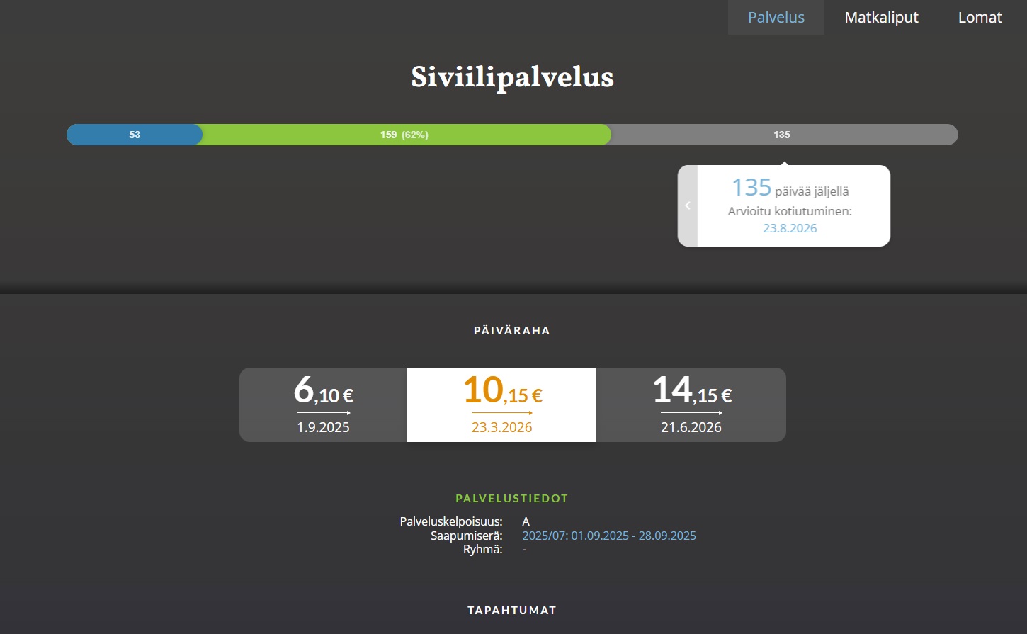 Näet palvelusaikasi Omasivarissa, heti kun sinut on hyväksytty siviilipalvelukseen ja tietosi löytyvät Omasivarista. Näet päivärahasi Omasivarin palvelus-osiossa, kun palveluksesi on alkanut. Korotuspäivämäärät tulevat näkyviin, kun työpalvelu on alkanut. Päiväraha määräytyy suoritettujen todellisten palveluspäivien mukaan (varusmiespalvelusajan alusta lähtien), ei kertoimella.
