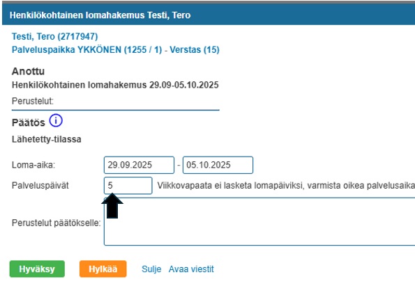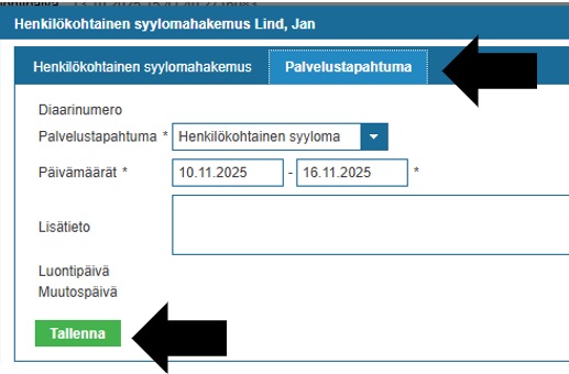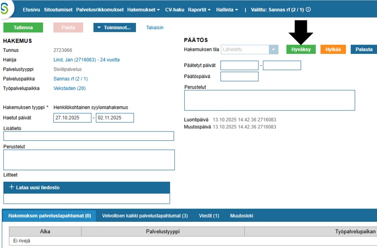 Muista luoda palvelustapahtuma hyväksymisen jälkeen. Avaa palvelustapahtuma välilehti, tarkista päivämäärät ja tallenna. Päätöksestä lähtee viesti hakijalle.