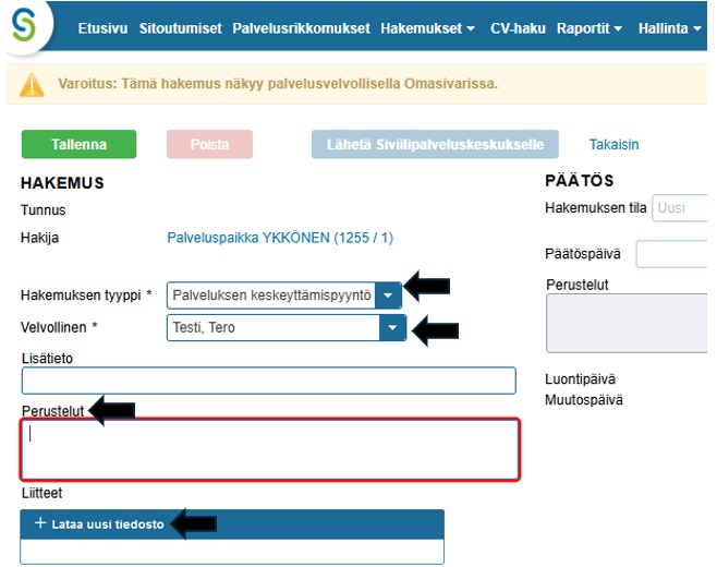 Valitse ”Palveluksen keskeyttämispyyntö” ja ketä pyyntö koskee. Perustele, lisää liitteet ja tallenna.