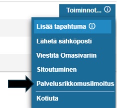 Sivariwebin etusivulla löytyy Siviilipalvelusvelvolliset-otsikko. Otsikon alta löytyy velvollisen nimi. Velvollisen nimen kohdalla, rivin oikealla laidalla löytyy ”Toiminnot…”-painike. Valitse ”Palvelusrikkomusilmoitus”.