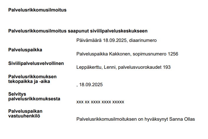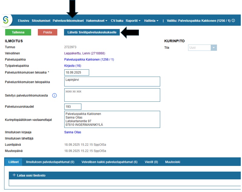 Ilmoitusta voi vielä tarvittaessa täydentää. Löytyy Palvelusrikkomukset-välilehden alta. Vastuuhenkilö lähettää palvelusrikkomusilmoituksen Siviilipalveluskeskukselle.