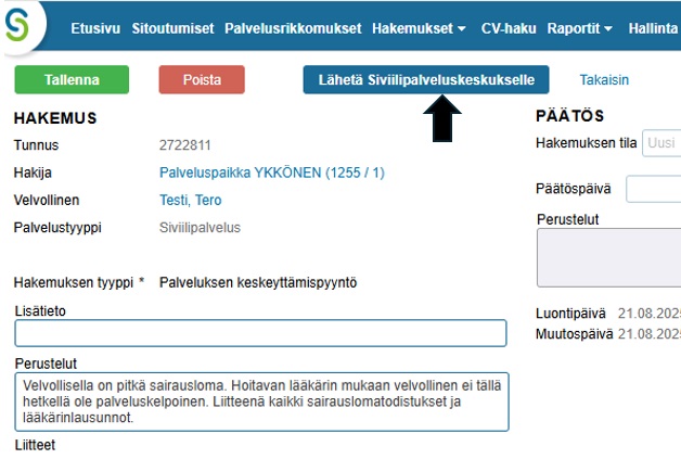 Tarkista tiedot. Tallenna ja lähetä pyyntö Siviilipalveluskeskukselle.