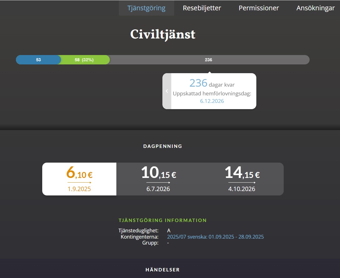 Du ser dagpenningens belopp under fliken tjänstgöring när du har börjat utbildningsperioden. Förhöjningsdagarna syns när arbetstjänsten har börjat. Eventuell beväringstid räknas till godo med en koefficient uträknad på den förordnade beväringstiden. När dagpenningens belopp räknas används ingen koefficient utan beväringstiden beaktas enligt utförda kalenderdagar.