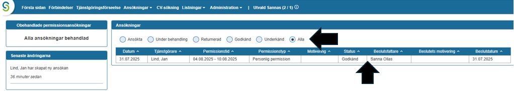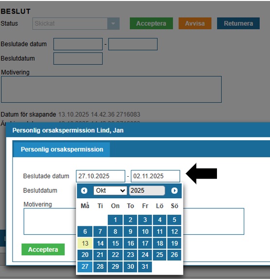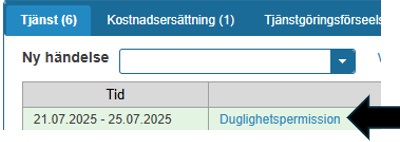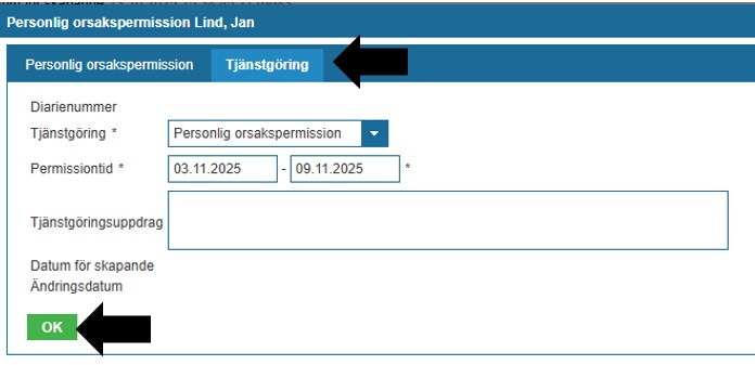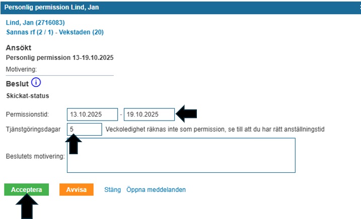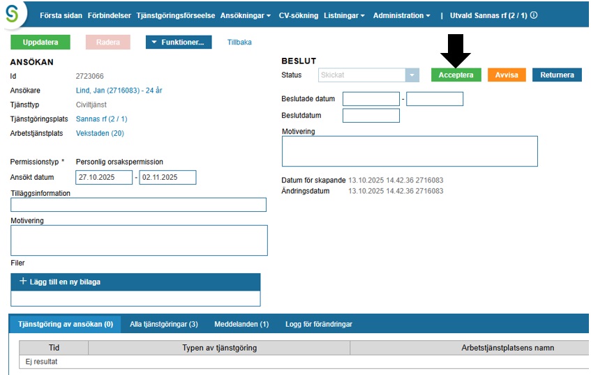 Kom ihåg att skapa tjänstgöringshändelse som motsvarar beslutet. Öppna ”Tjänstgöring”-fliken, kontrollera datum och tryck ok. Beslutet kommer att meddelas den sökande.