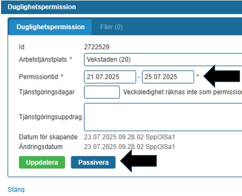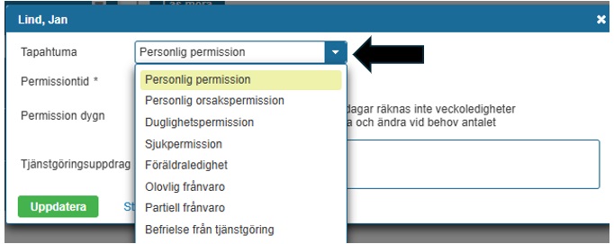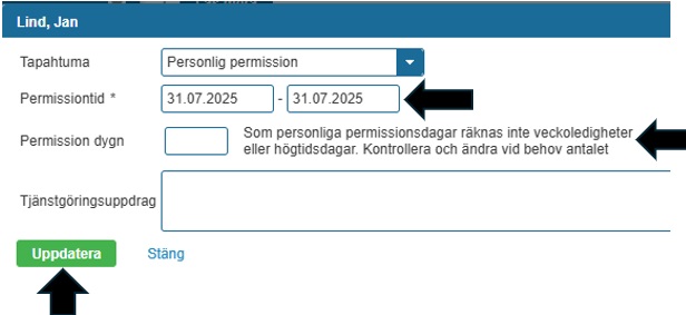 Tjänstgöringsplatsen kan vid behov eller enligt överenskommelse anteckna den personliga permissionen i Sivariweb manuellt.