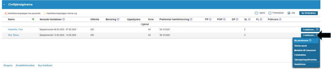 Öppna anmälan om tjänstgöringsförseelse i rullgardinsmenyn ”funktioner” på Sivariwebs framsida. Hittas på raden längst till höger om den tjänstgörares namn som du ska göra anmälan om.