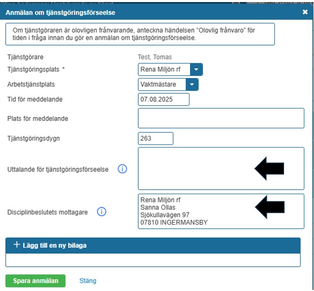 Civiltjänstgöringsplatsens kontaktperson kan registrera förseelser i anmälan, men anmälan ska alltid undertecknas av civiltjänstgöringsplatsens ansvarsperson.