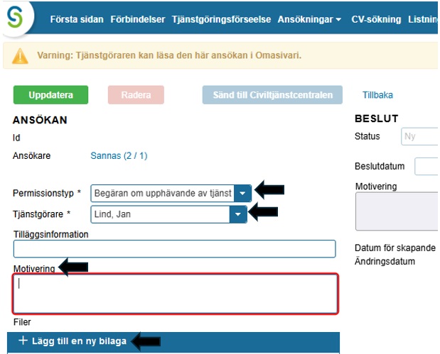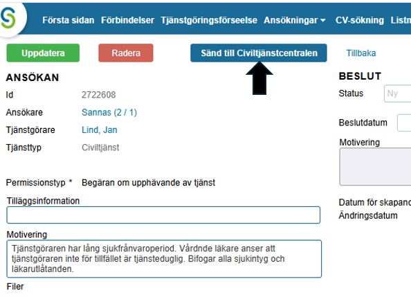 Kontrollera uppgifterna. Uppdatera och sänd ansökan till Civiltjänstcentralen.