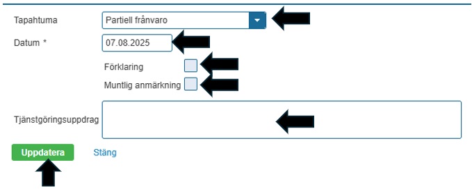 Om tjänstgöraren försenar sig eller olovligen avlägsnar sig från tjänstgöringen under dagen kan händelsen antecknas som ”Partiell frånvaro”.