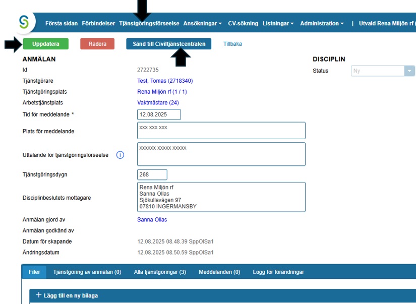 Sparad anmälan hittas under ”Tjänstgöringsförseelse”. Anmälan kan uppdateras innan ansvarspersonen sänder anmälan till Civiltjänstcentralen.